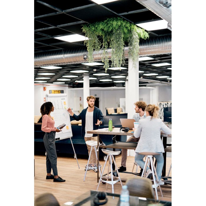Drinking bottle in RPET with rubberised finish (frosted transparent) and stainless steel cap with inner RPET lid and silicone ring. BPA free. Leak-free. Capacity: 600 ml. Not suitable for carbonated drinks.