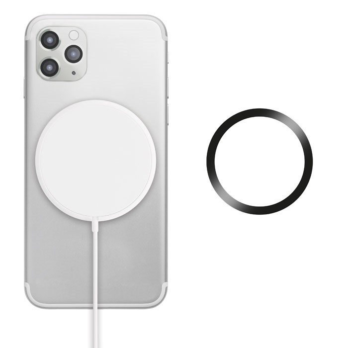 Magnetic wireless charger in ABS. Output: DC 9V/1.1A (10W) for quick charging. Including additional magnetic metal ring to support charging of other non-magnetic wireless chargeable phones.