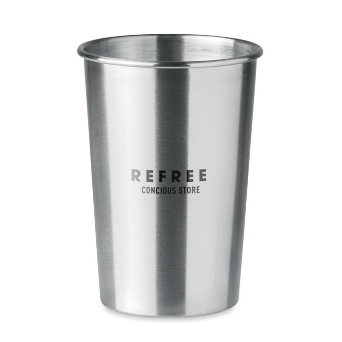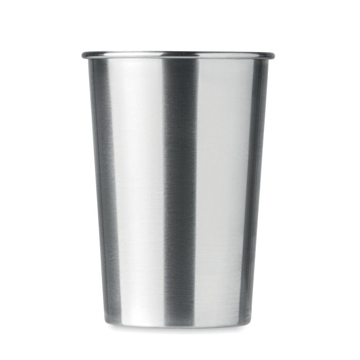 Stainless Steel cup. Capacity: 350 ml. As this is a single walled mug heat transfer can still occur.