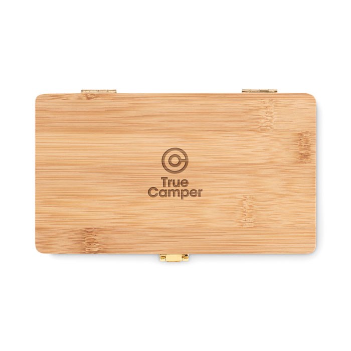 Handy 21 pieces tool set presented in a natural looking bamboo case. The perfect gift for a DIY handyman or amateur carpenter. This useful box has all the essential tools one should have in their home in case repairs are needed or small projects come up. It contains 3 screwdrivers, 10 bits in holder, 3 slotted sizes, 3 Torx sizes and 1 adapter, 4 sockets , 1pc cutter, 1 handle and 1 connector. Bamboo is a natural product, there may be slight variations in colour and size per item, which can affect the final decoration outcome. Box size 19 ,5x11,8x3 cm. FSC®-certified | FSC 100%, N5.7, FSC-C213206