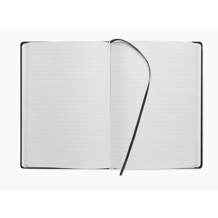 A5 notebook with hard PU cover. Casebound. 200 lined pages (100 sheets) in recycled paper (80 gsm). Matching elastic closure strap and ribbon page-marker. Made in EU.
