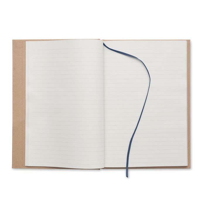 A5 notebook with hard recycled carton cover. Casebound. 200 lined recycled paper pages (100 sheets/80 gsm). Elastic closure strap and ribbon page-marker. Made in EU.