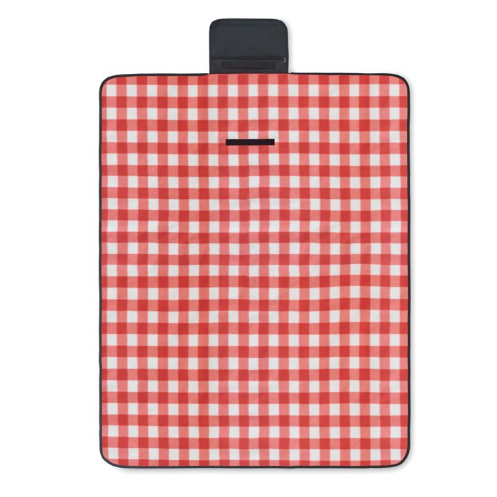 Foldable RPET 150 gr/m² polar fleece picnic blanket with water resistant coated PEVA reverse side. Includes a front zipper pocket and short carry strap.