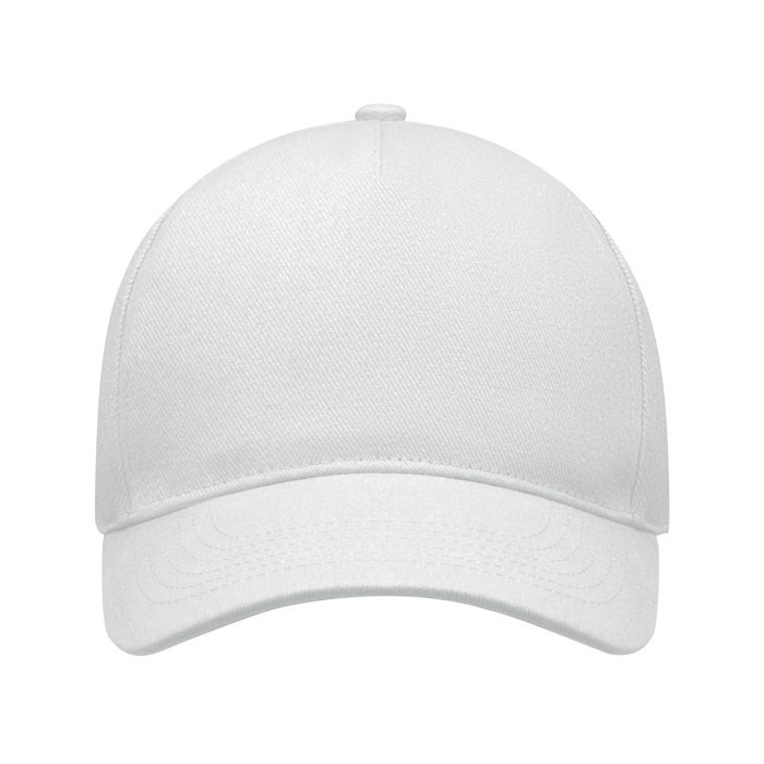 5 panel baseball cap in heavy brushed twill cotton 260 gm/m2 with silver steel buckle. 4 embroidered eyelets in matching colour. Size 7 1/4.
