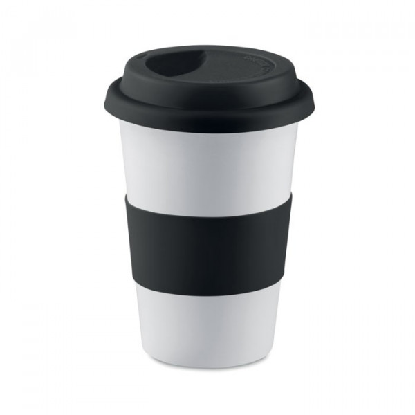 Single walled ceramic mug with silicone lid and wrap band. 400ml capacity. Ceramic transfer is dishwasher safe. As this is a single walled mug heat transfer can still occur.