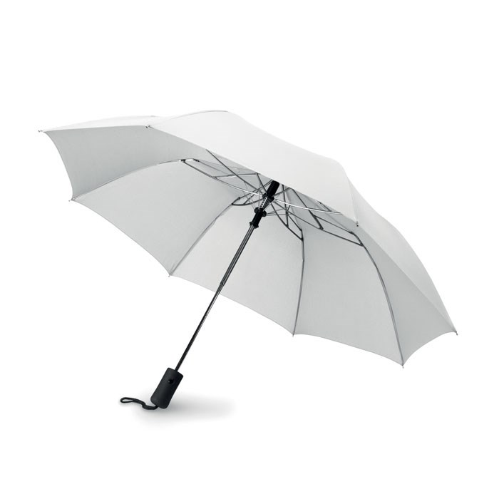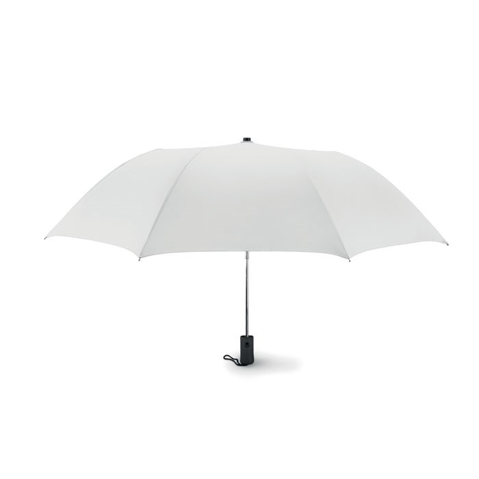 21 inch 2 fold auto open umbrella in 190T pongee with zinc plated steel shaft, ribs and tips. Black rubberised ABS handle. Includes matching pouch. Manual closure.