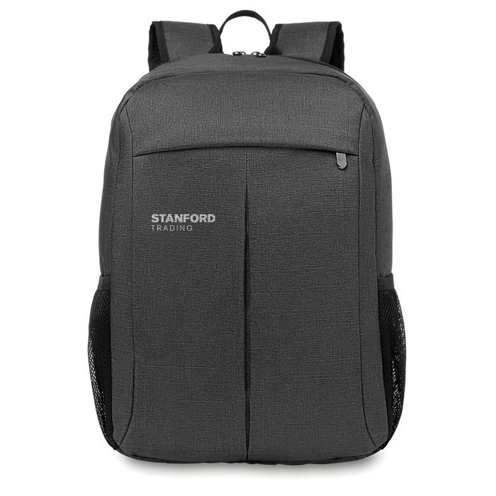 15 Inch computer backpack in 360D 2 tone polyester. Includes one internal 15 inch laptop compartment and one main front part with zipper pocket. Padded back and shoulder straps. Additional pocket for Tablet compartment. Trolley holder back side.