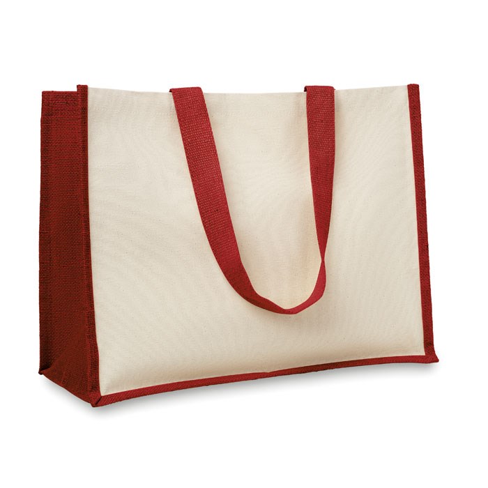 Jute shopping bag laminated with front in canvas and cotton webbing. Long handles.