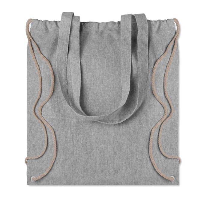 2 tone recycled cotton and recycled polyester shopping bag with drawstring and long handles (20%/80%). Approx. 140 gr/m². This item can shrink after printing.