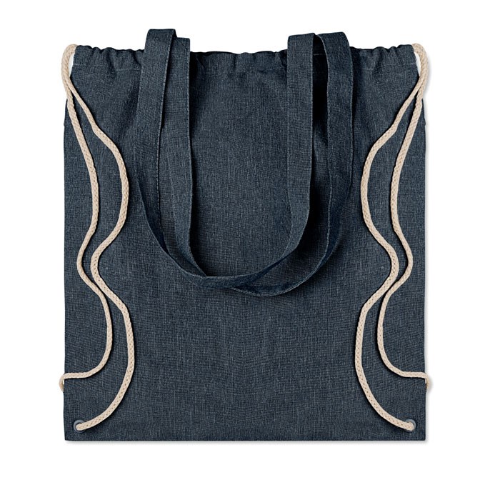 2 tone recycled cotton and recycled polyester shopping bag with drawstring and long handles (20%/80%). Approx. 140 gr/m². This item can shrink after printing.