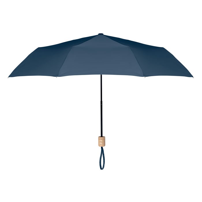 Foldable 21 inch umbrella, 3 sections with 190T RPET pongee fabric, black plated frame and ribs with wooden handle. Manual open and closure. Self material pouch.