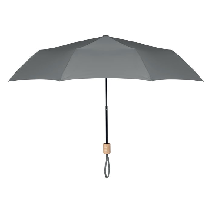 Foldable 21 inch umbrella, 3 sections with 190T RPET pongee fabric, black plated frame and ribs with wooden handle. Manual open and closure. Self material pouch.