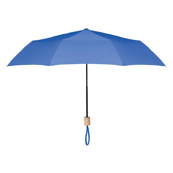 Foldable 21 inch umbrella, 3 sections with 190T RPET pongee fabric, black plated frame and ribs with wooden handle. Manual open and closure. Self material pouch.