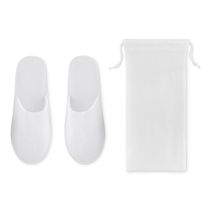 Pair of polyester hotel slippers presented in a non woven pouch. EUR size 43 - 44.
