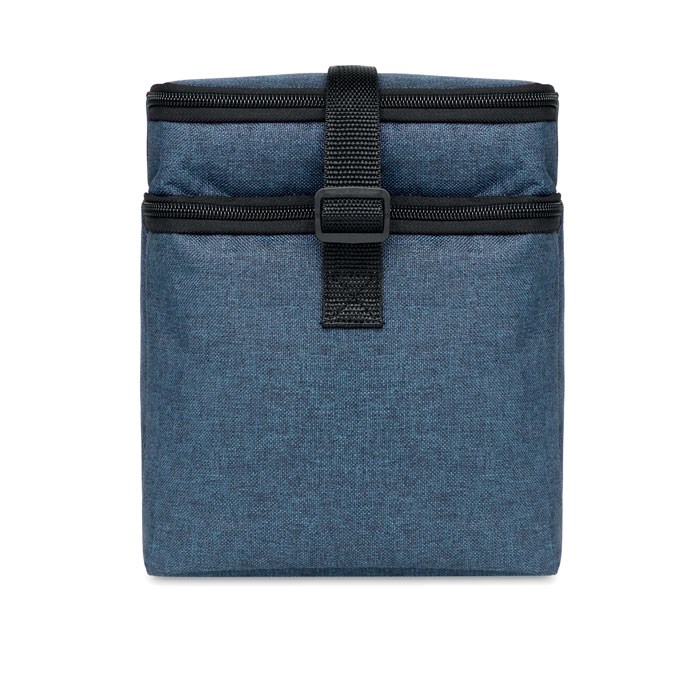 2 tone 600D RPET cooler bag with 2 compartments and PEVA lining. Adjustable shoulder strap and front pocket. Isolation material: 0.15mm PEVA + 3mm foam.