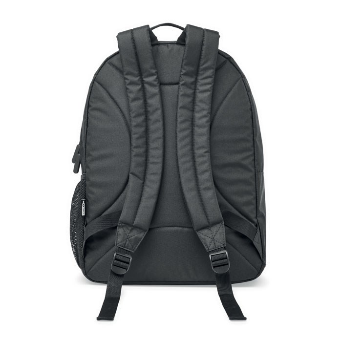15 inch laptop backpack in 300D RPET polyester. It has 2 large zippered compartments, double zippered front pockets and mesh side pocket. Padded back, bottom and shoulder straps.