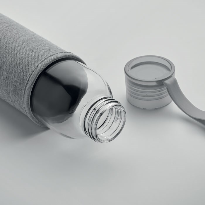 Recycled glass bottle with neoprene pouch and PP lid with silicone hanger. Leak free. Capacity: 500 ml.