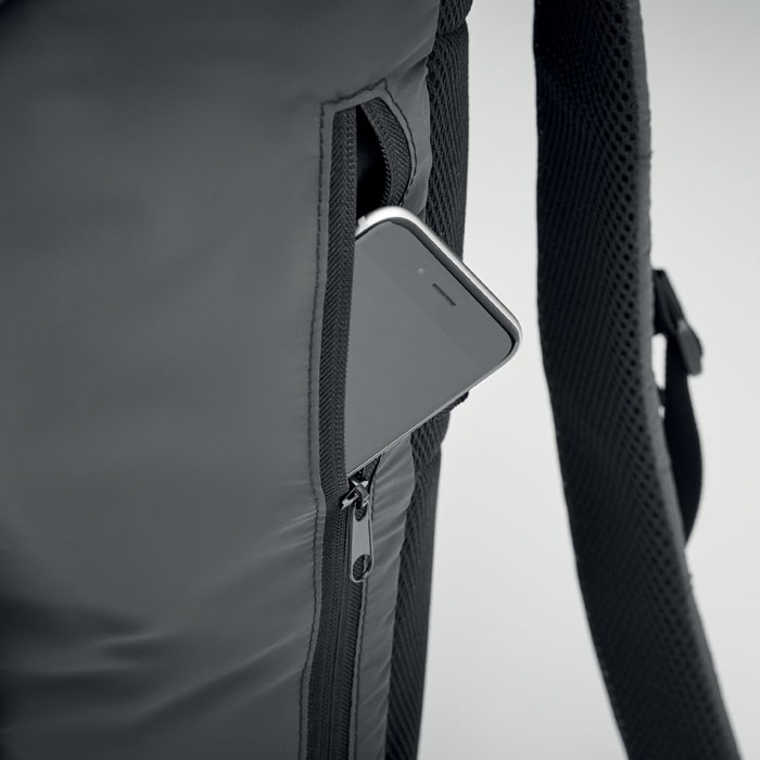 Outdoor backpack in 190T polyester coated with reflective granules. Side zippered outer pocket and padded back, inner lining with drawcord closure. One large padded inner laptop compartment. It has adjustable padded shoulder straps and adjustable chest and waist strap with buckle closure. Water repellent.