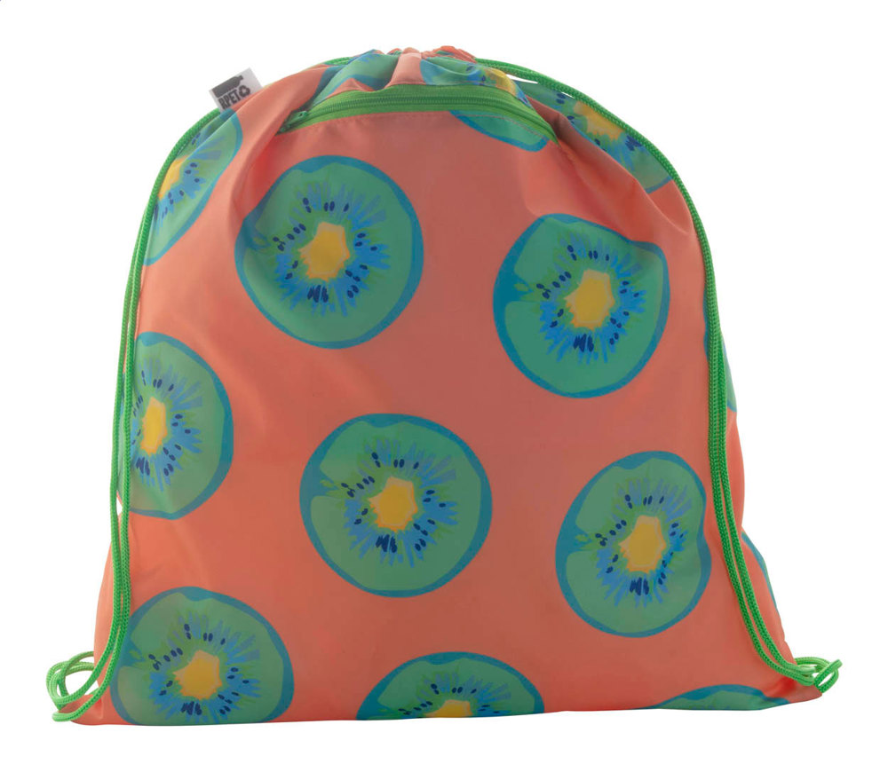 Custom made drawstring bag with zipped front pocket, 190T RPET polyester. With all over sublimation printed graphics and distinctive RPET label. MOQ: 25 pcs.