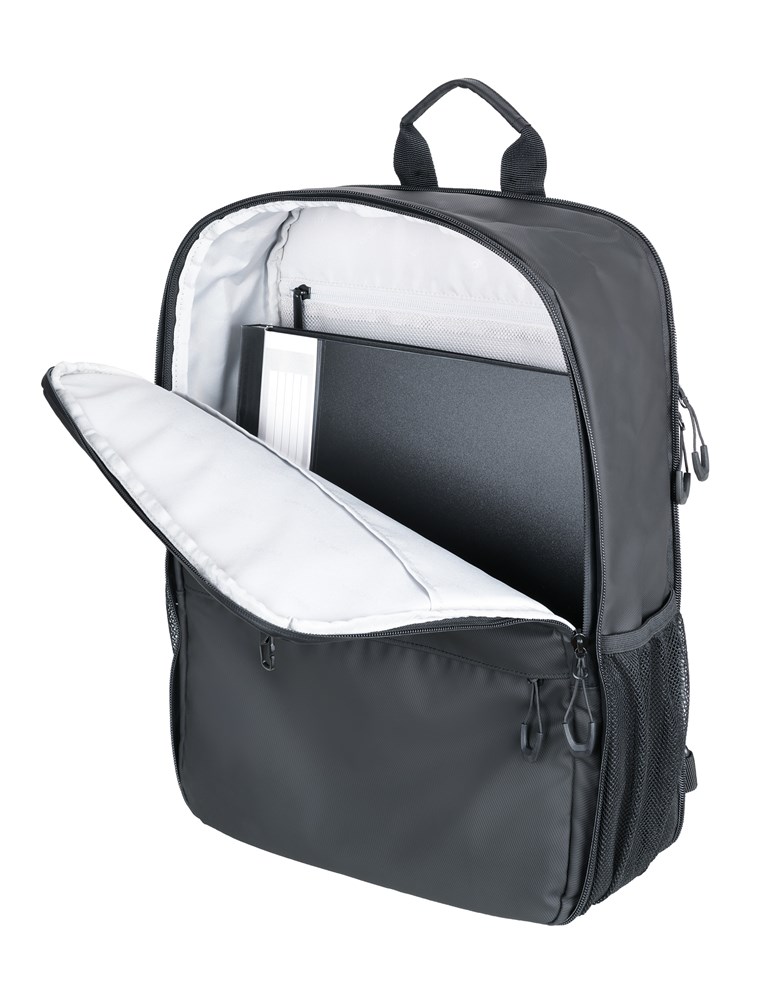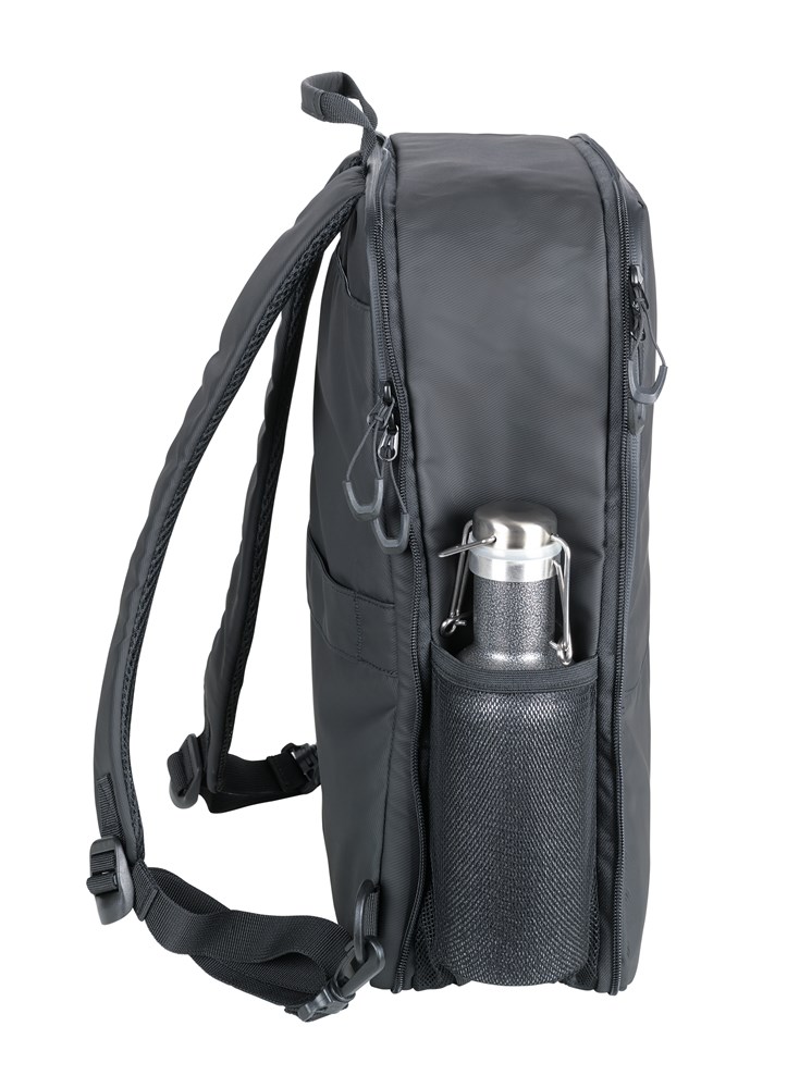 Laptop backpack with 2 large compartments (padded laptop compartment up to 16'' and main compartment) with 2-way zip closure, expandable through additional zip, 1 front pocket with hidden mini carabiner (anti-theft) + additional front pocket, expanded 2 mesh pockets for bottle and umbrella, reinforced base, loop for attaching to trolley, carrying handle, hidden backpack straps, water-repellent zips on the outside, hard-wearing material, splash-proof (waterproof rating IPX4), capacity expandable from approx. 6 litres to approx. 14 litres, Tarpaulin: 80% Polyester, 20% Polyurethan (PU), polyester, polyurethane, tarpaulin (tarp), black