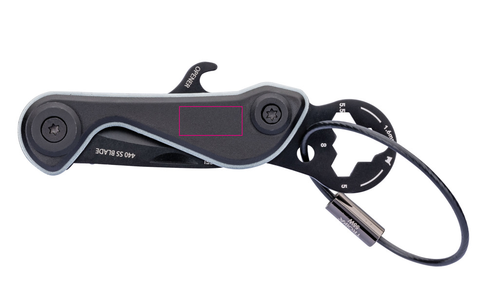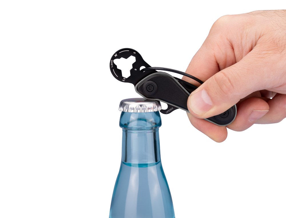 Mini tool with 9 functions, shopping trolley release, parcel cutter + blade made of 440 stainless steel with snap-in function, keyring (wire loop), bottle opener, hexagonal key (3 sizes), tyre depth gauge (1.6 mm), 440 stainless steel, aluminium, anodised, black/titanium coloured