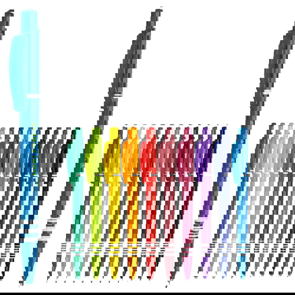 The Tropic Colour ball pen in hardcolour has a large imprint space on both, clip, and barrel. With a coloured barrel, pusher, and clip. The barrel has three white coloured rings. Includes a pusher mechanism and a blue writing Jumbo refill. The pen is made of ABS plastic and is made in Europe. From orders of 5.000 pieces, you can choose your own colour combination.
