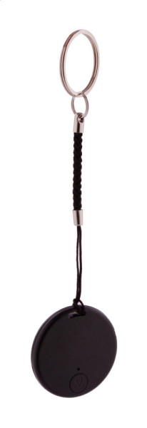 Wireless anti-lost key finder device with camera shutter, in round shaped plastic housing. With string and metal keyring. With button cell battery. Operates with a free iOS / Android App.