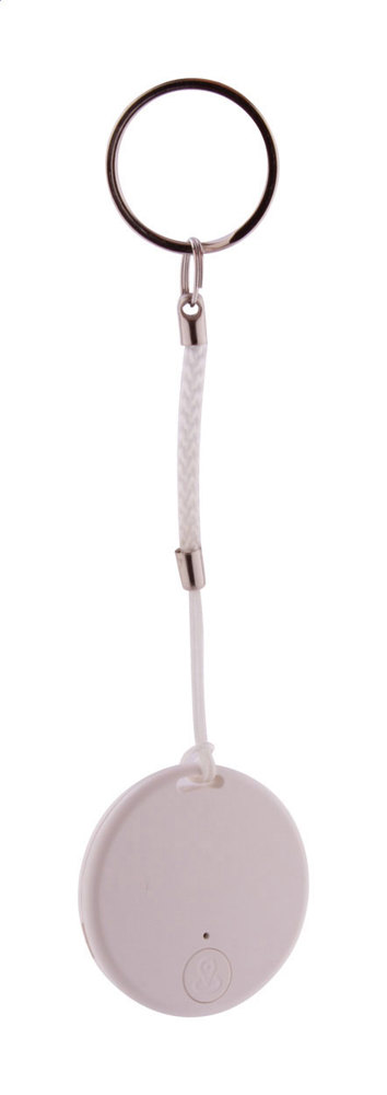 Wireless anti-lost key finder device with camera shutter, in round shaped plastic housing. With string and metal keyring. With button cell battery. Operates with a free iOS / Android App.