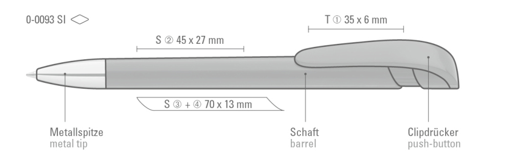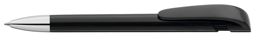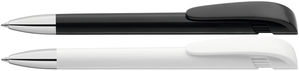 Retractable ballpoint pen with opaque glossy housing in black or white, wide curved clip button and heavy metal tip chrome plated.