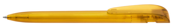 Retractable ballpoint pen with transparent glossy housing and wide curved clip button. more