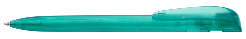 Retractable ballpoint pen with transparent glossy housing and wide curved clip button. more