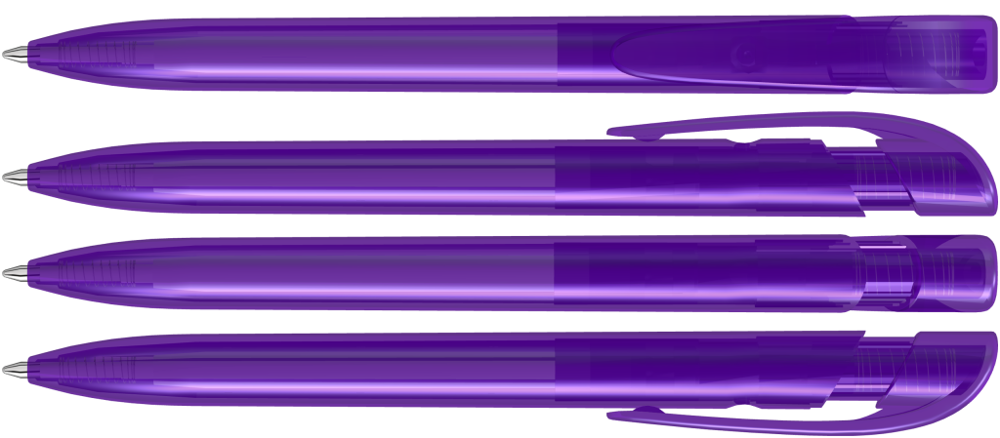 Retractable ballpoint pen with transparent glossy housing and wide curved clip button. more