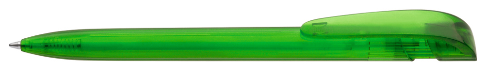 Retractable ballpoint pen with transparent glossy housing and wide curved clip button. more