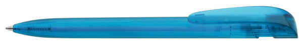 Retractable ballpoint pen with transparent glossy housing and wide curved clip button. more