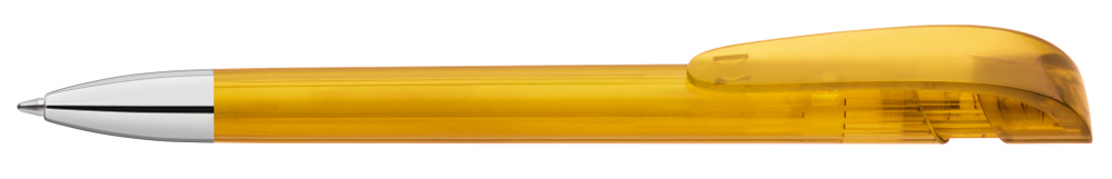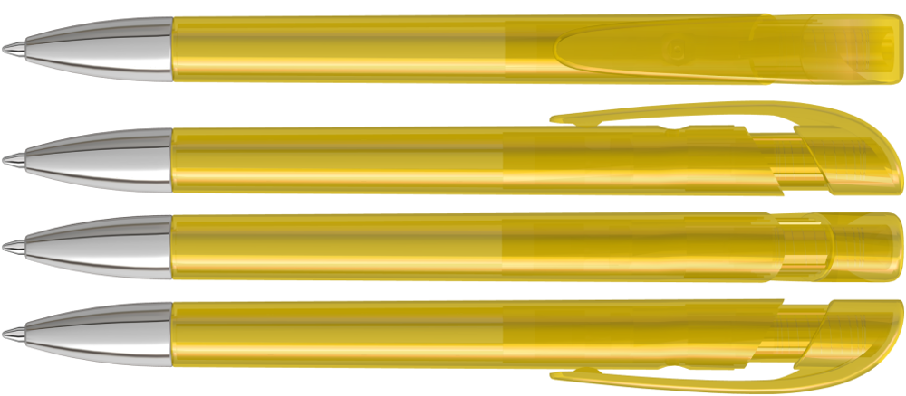 Retractable ballpoint pen with transparent glossy housing, wide curved clip button and heavy metal tip chrome plated.
