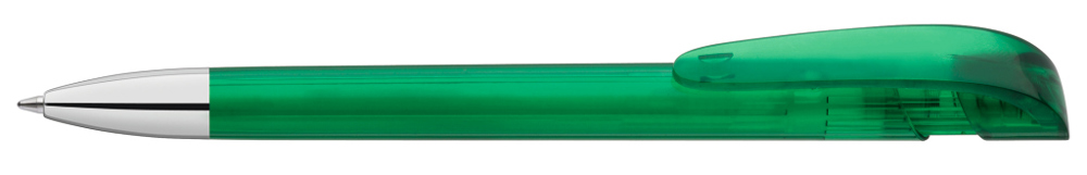 Retractable ballpoint pen with transparent glossy housing, wide curved clip button and heavy metal tip chrome plated.