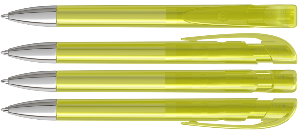 Retractable ballpoint pen with transparent glossy housing, wide curved clip button and heavy metal tip chrome plated.
