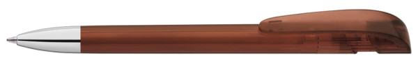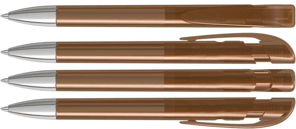 Retractable ballpoint pen with transparent glossy housing, wide curved clip button and heavy metal tip chrome plated.