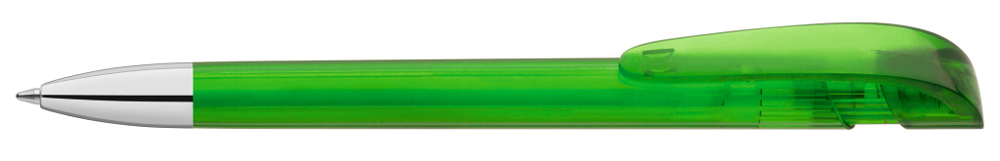 Retractable ballpoint pen with transparent glossy housing, wide curved clip button and heavy metal tip chrome plated.
