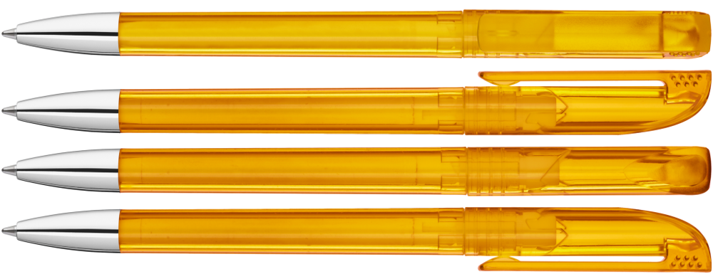 Twist ballpoint pen with transparent glossy housing, matt clip surface and tip chrome plated.