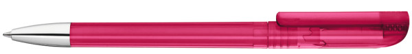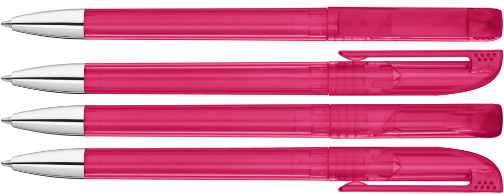 Twist ballpoint pen with transparent glossy housing, matt clip surface and tip chrome plated.