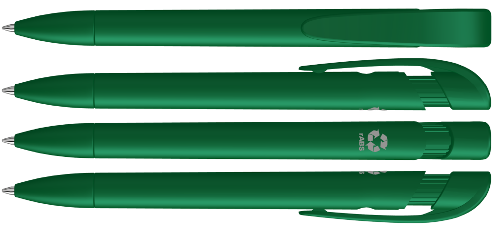 Retractable ballpoint pen with opaque matt housing, wide curved clip button and tip made from recycled plastic.