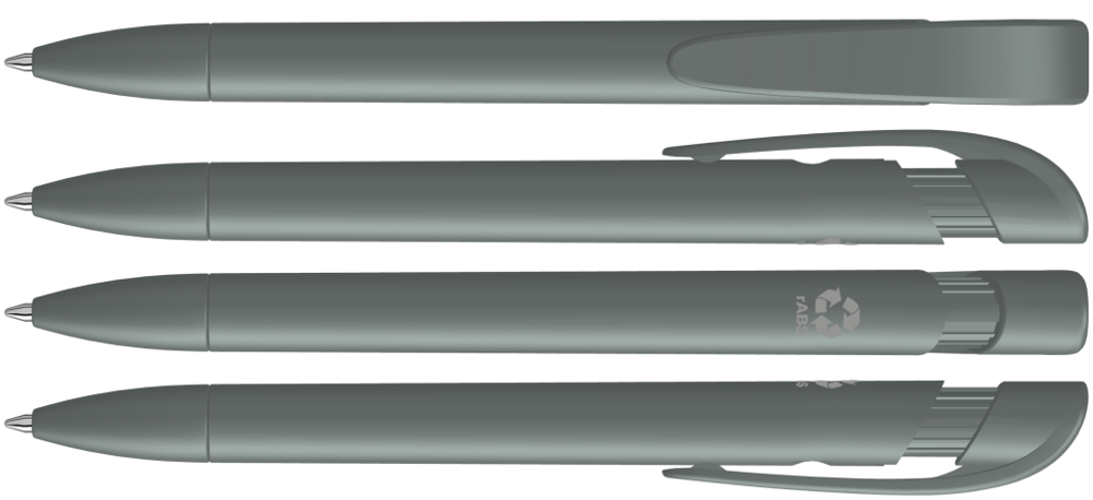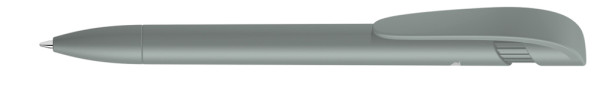 Retractable ballpoint pen with opaque matt housing, wide curved clip button and tip made from recycled plastic.