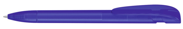 Retractable ballpoint pen with transparent frosted housing, wide curved clip button and tip.