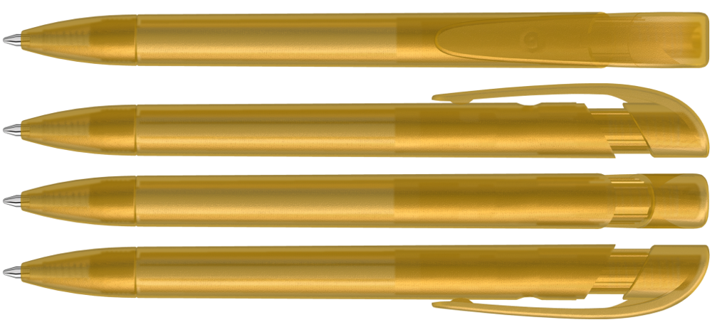 Retractable ballpoint pen with transparent frosted housing, wide curved clip button and tip. more