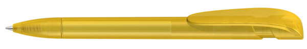 Retractable ballpoint pen with transparent frosted housing, wide curved clip button and tip.