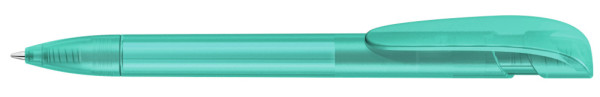 Retractable ballpoint pen with transparent frosted housing, wide curved clip button and tip.