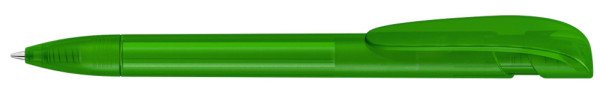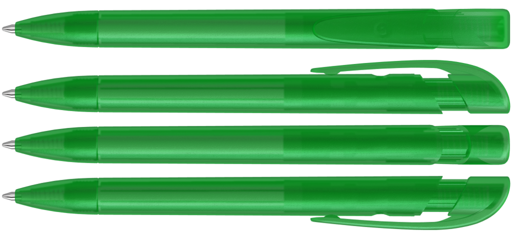 Retractable ballpoint pen with transparent frosted housing, wide curved clip button and tip.