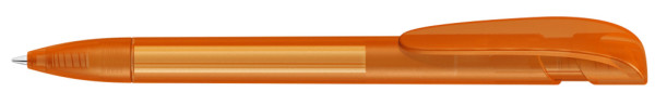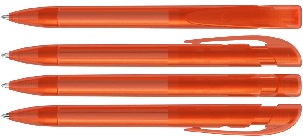 Retractable ballpoint pen with transparent frosted housing, wide curved clip button and tip. more