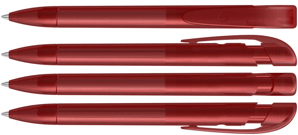 Retractable ballpoint pen with transparent frosted housing, wide curved clip button and tip. more